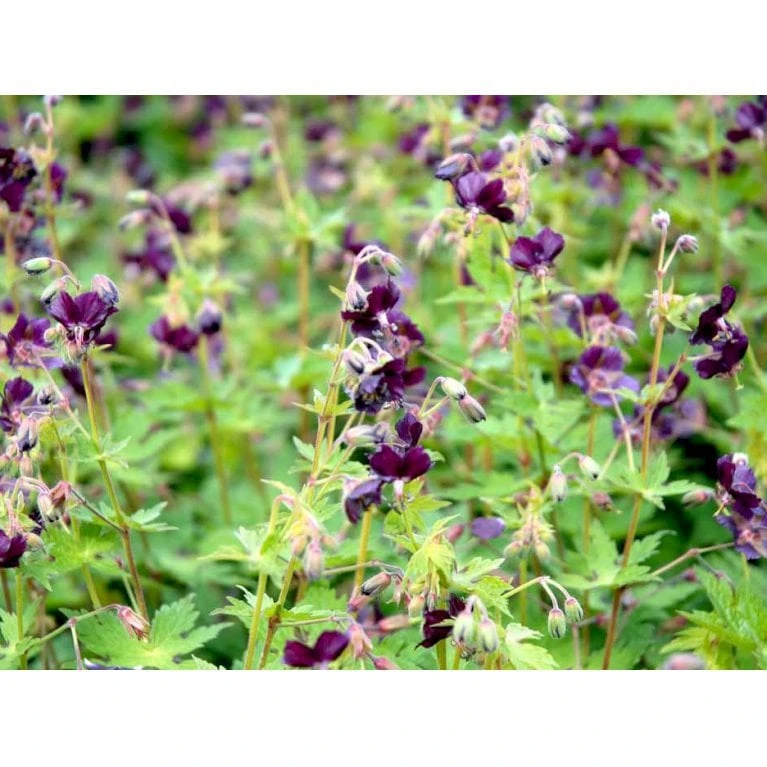 Juni -juli. Lillasorte, nikkende blomster højt hævet over løvet.