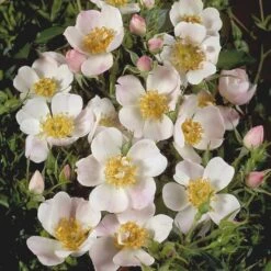 Flade, enkle dværgblomster med en let og dejlig vildrose duft. 5-10 kronblade. 3-5 cm i diameter.