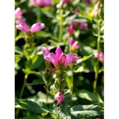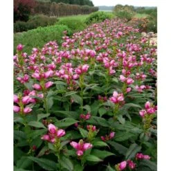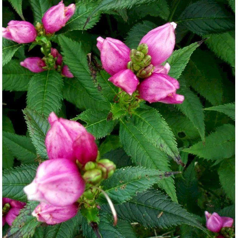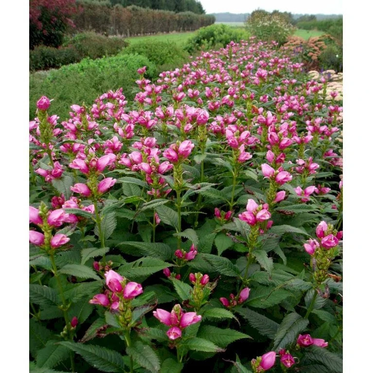 August – september. Store buttede rosa blomster, som sidder tæt op ad stilken.