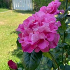 Ren og klar pink til rosa, mørkest i midten. Stor dobbelt blomst med middelstærk og behagelig duft – klassisk rosenduft blandet med pibetobak.