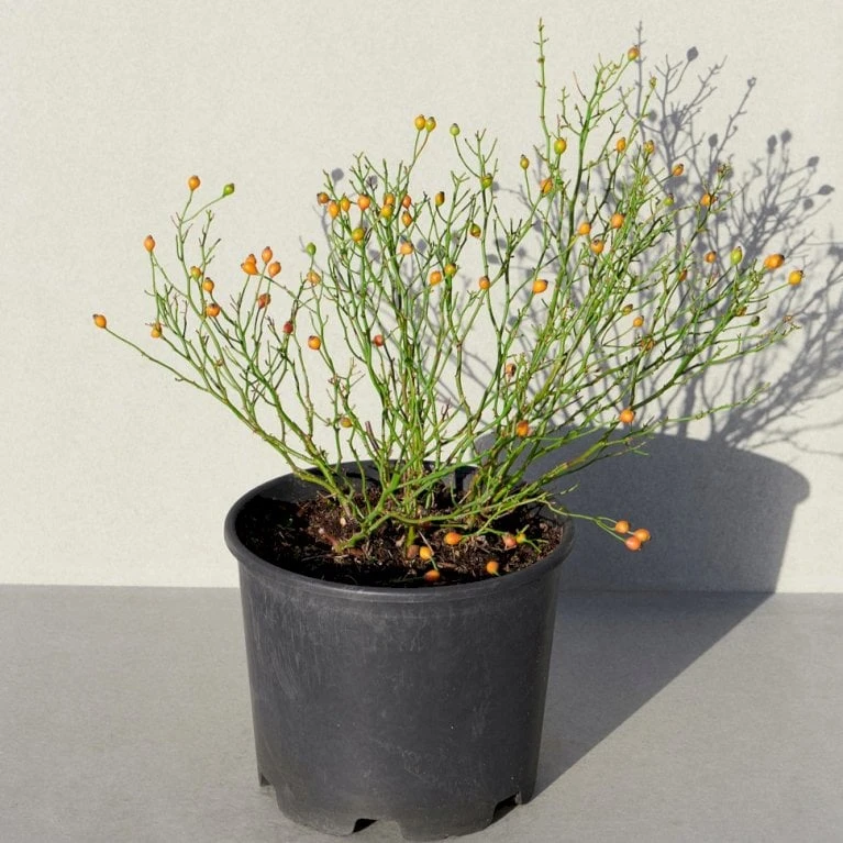Blomster i juni-november. Sammen med sidste hold blomst ses talrige små røde hyben, som senere ædes af fugle.