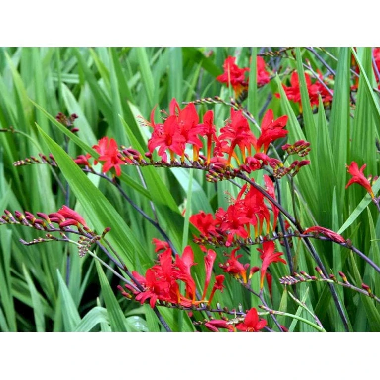 Juli – september. Talrige rødorange elegante blomster, græslignende løv.