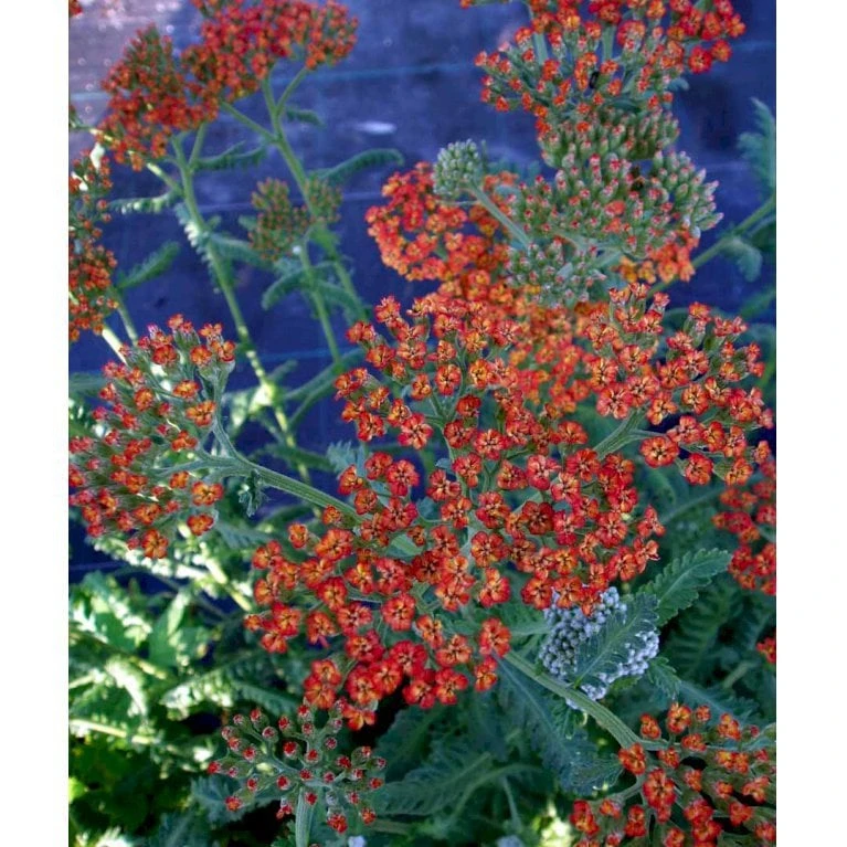 Juni-august. Store flade stande, hver bestående af mange små blomster som veksler i toner af orange og rødbrun.
