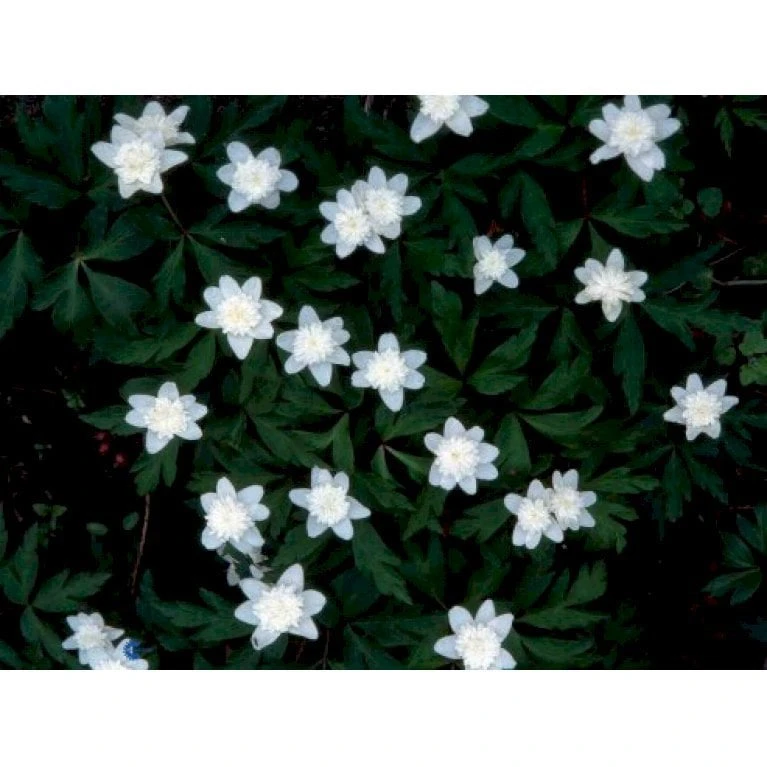 April-maj. Rent hvide, stærkt fyldte blomster på tynde stilke over det fligede løv.