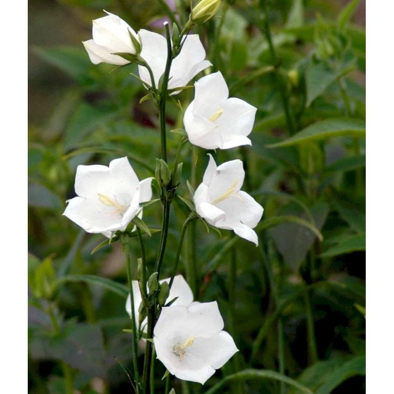 Juni- juli, ofte nogen efterblomstring i september. Store hvide klokkeblomster på lange stilke over det smalle løv.