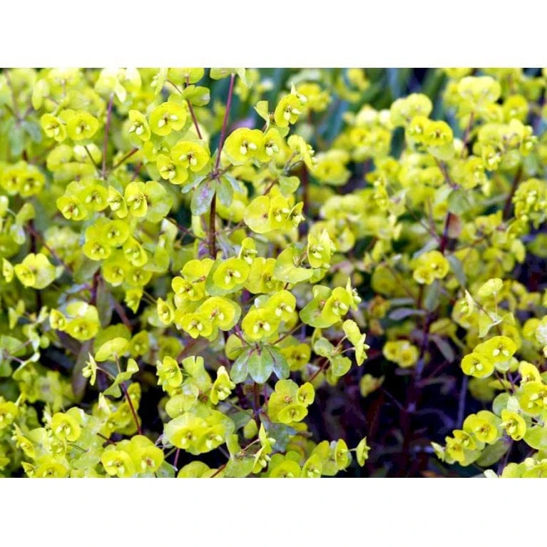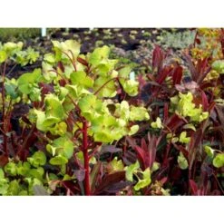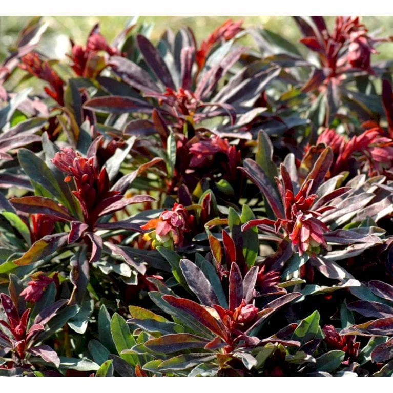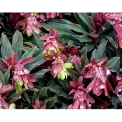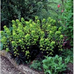 April-juni. Særprægede blomster i rød og limegrøn, små blomster samlet i store stande.